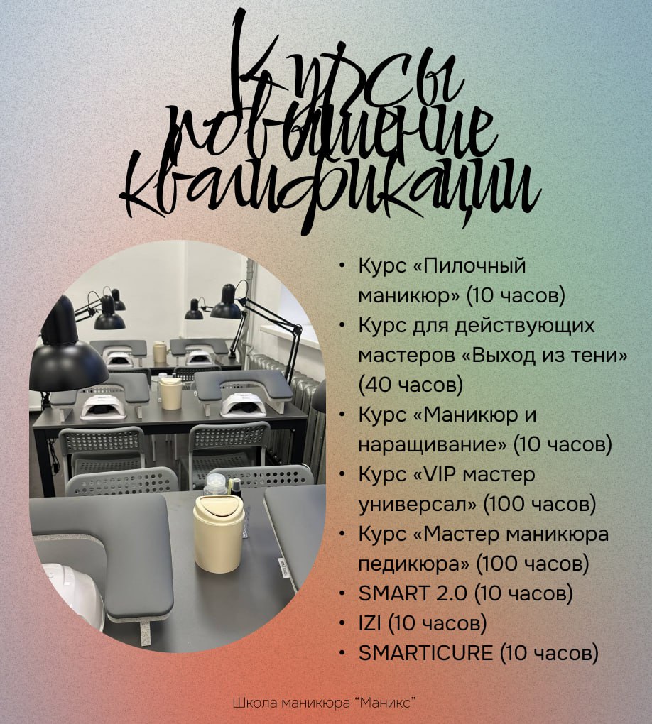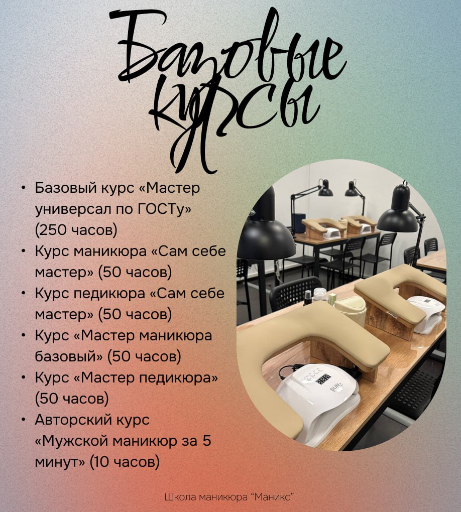 👈Для новичков: Получите прочную базу, уверенность и освоите трендовые техники на базовых курсах маникюра, педикюра и универсальных программах.